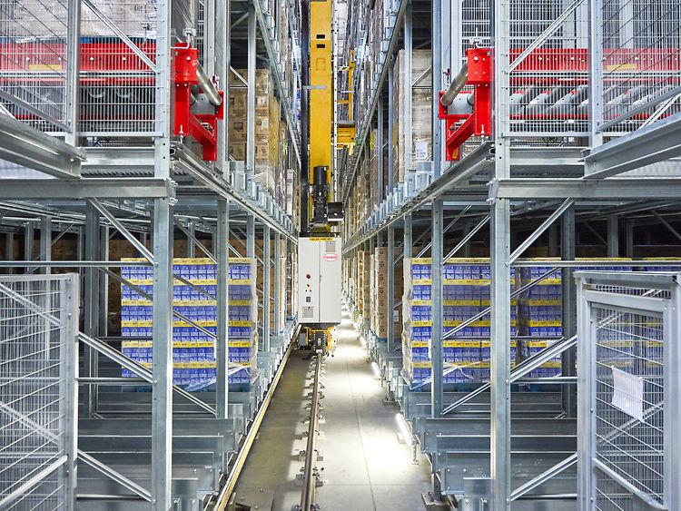 The automated area is divided into five blocks. Each block provides a special stacker crane with 38 double cycles per hour and two high-tech conveyors serve to unload and load shuttles from the production site automatically. Also, the loading and unloading of pallets from trucks can be done automatically through a new automatic launcher transport system due to newest technologies and digitized supply chain processes. Through the implementation of a new innovative management software, the warehouse’s energy consumption can be reduced through eliminating inefficiencies while at the same time increasing the storage capacities. The safety of equipment is guaranteed by a modern fire protection system and the highest work protection standards.